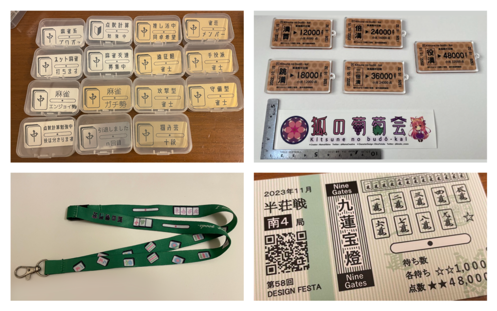 狐の葡萄会の日々野まむです。初心者の方からプロの方まで身につけられるネームプレートや麻雀グッズガチャを持ち込みます。実用的な麻雀グッズや新作も用意していますので、MCM当日会場にてよろしくお願いします。